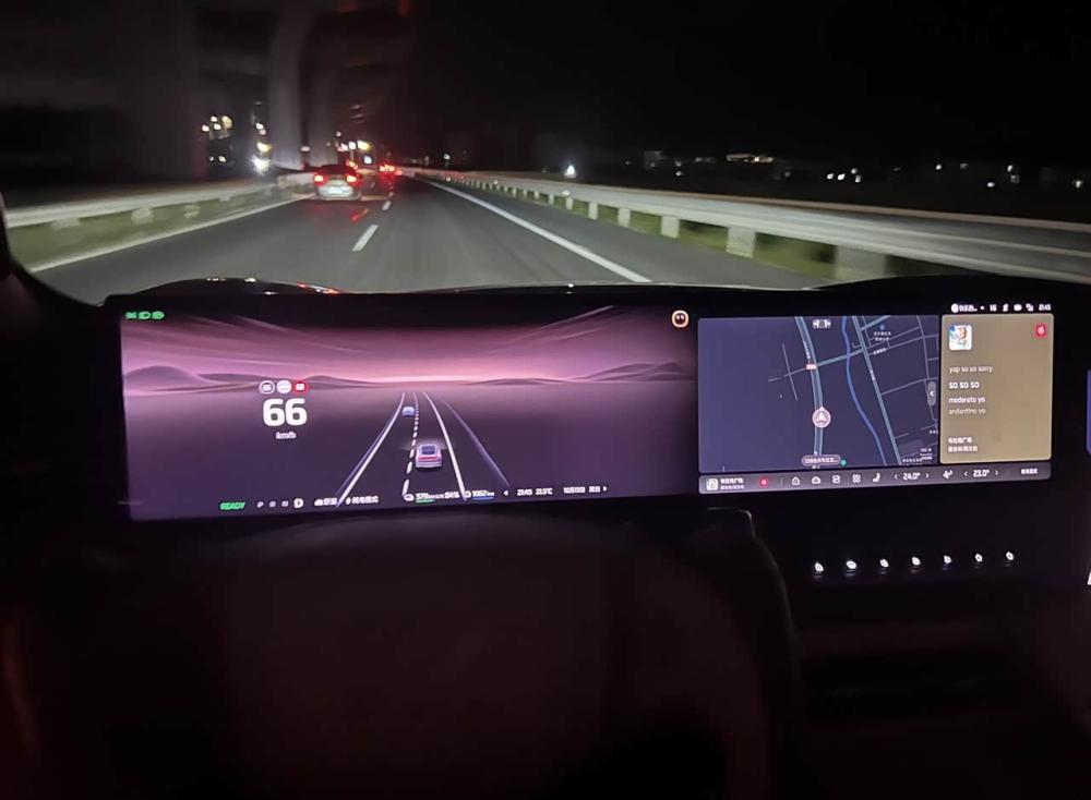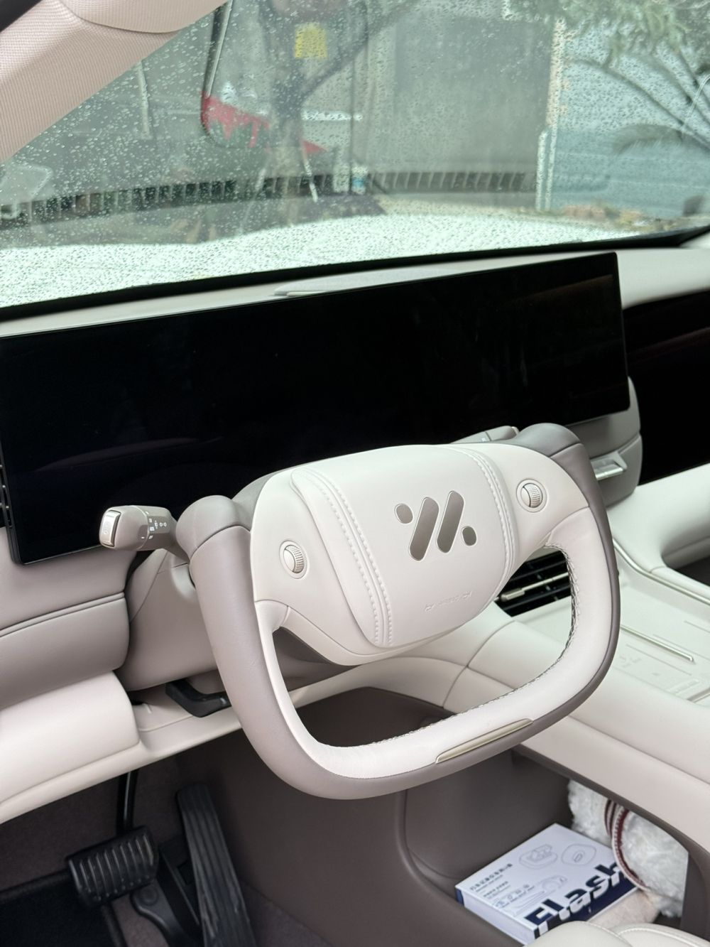 外观不是很惊艳,但一眼看上去很舒服,干净利落,符合我对新能源车的审美。T字形大灯造型特别犀利,晚上点亮后特别醒目,有意思的是过节还能显示祝福文案,挺有意思的😄。第一印象就是“精致不浮夸”。中控和门板大面积用的软包材质,手感很舒服,没有塑料的廉价感。皮质座椅支撑性也不错,加热通风都有,长途开车也不会腰酸背痛啦😌!