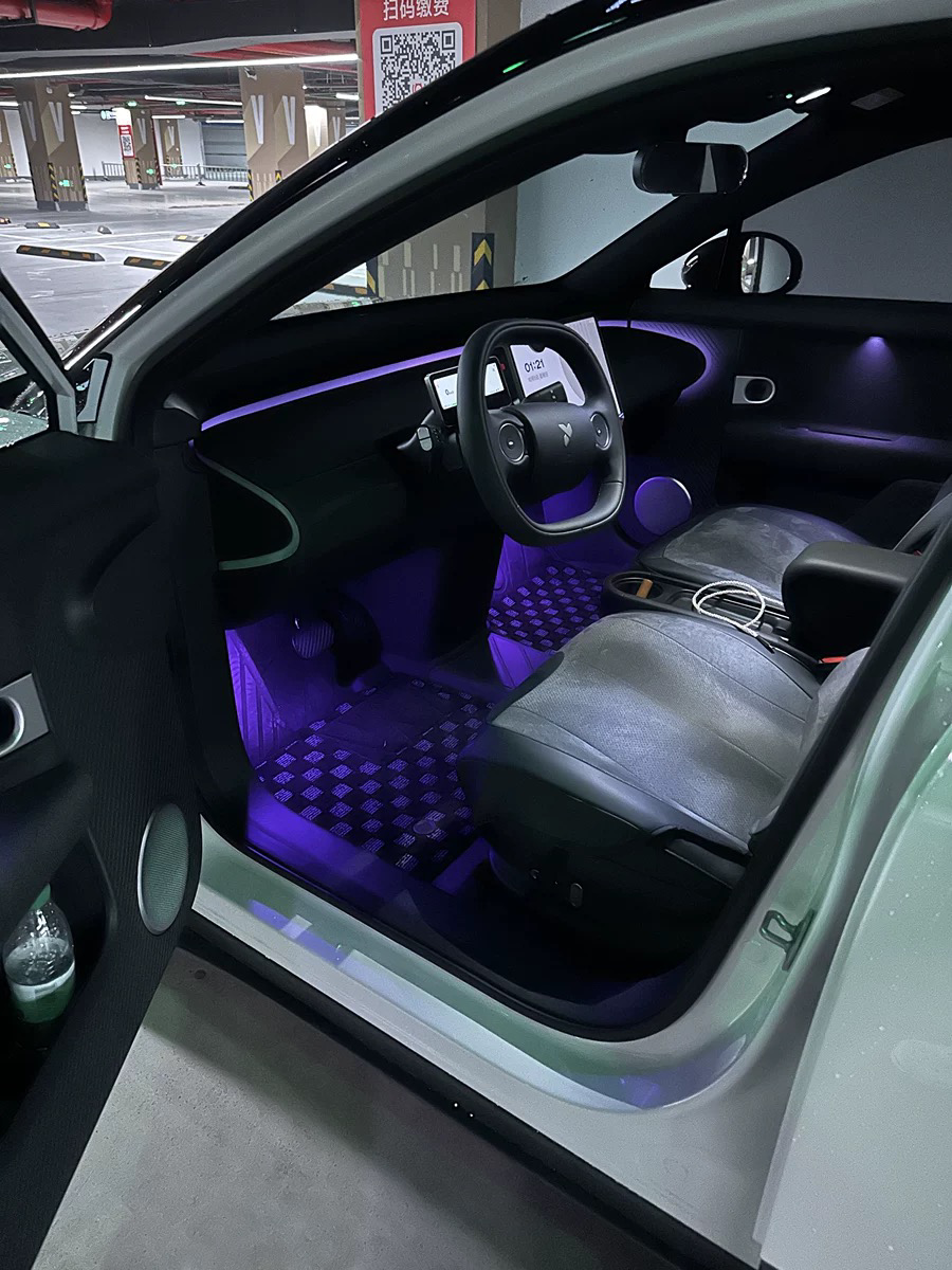 我选的是白色外观,本来想做独特设计的车衣,但最后还是贴了简简单单的透明车衣,防剐蹭,还不用加钱😉。紫色内饰是我花3000元选的,深色不怕脏,就是选择少了点,要是能有更多拼色设计就更好了。座椅是发光版带通风功能的,夏天最需要了。这车在小城市开,基本不会撞款,每次开出去都挺惊喜的,感觉这是独属于自己的选择😍~